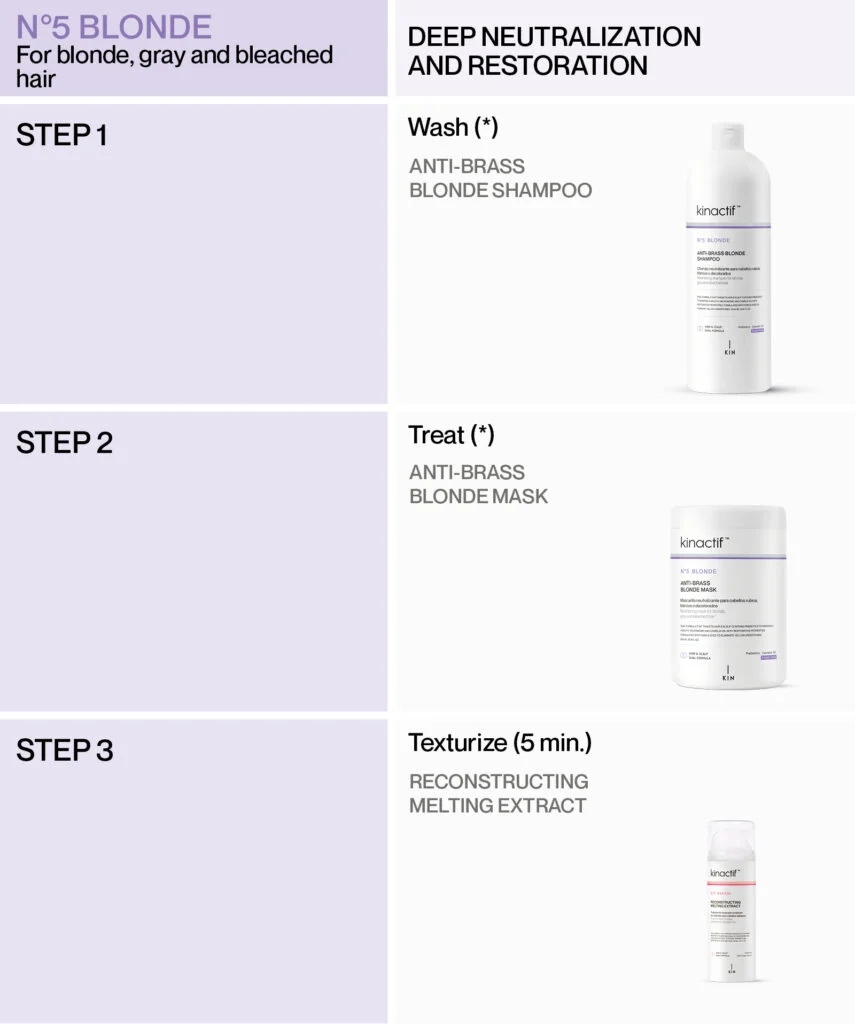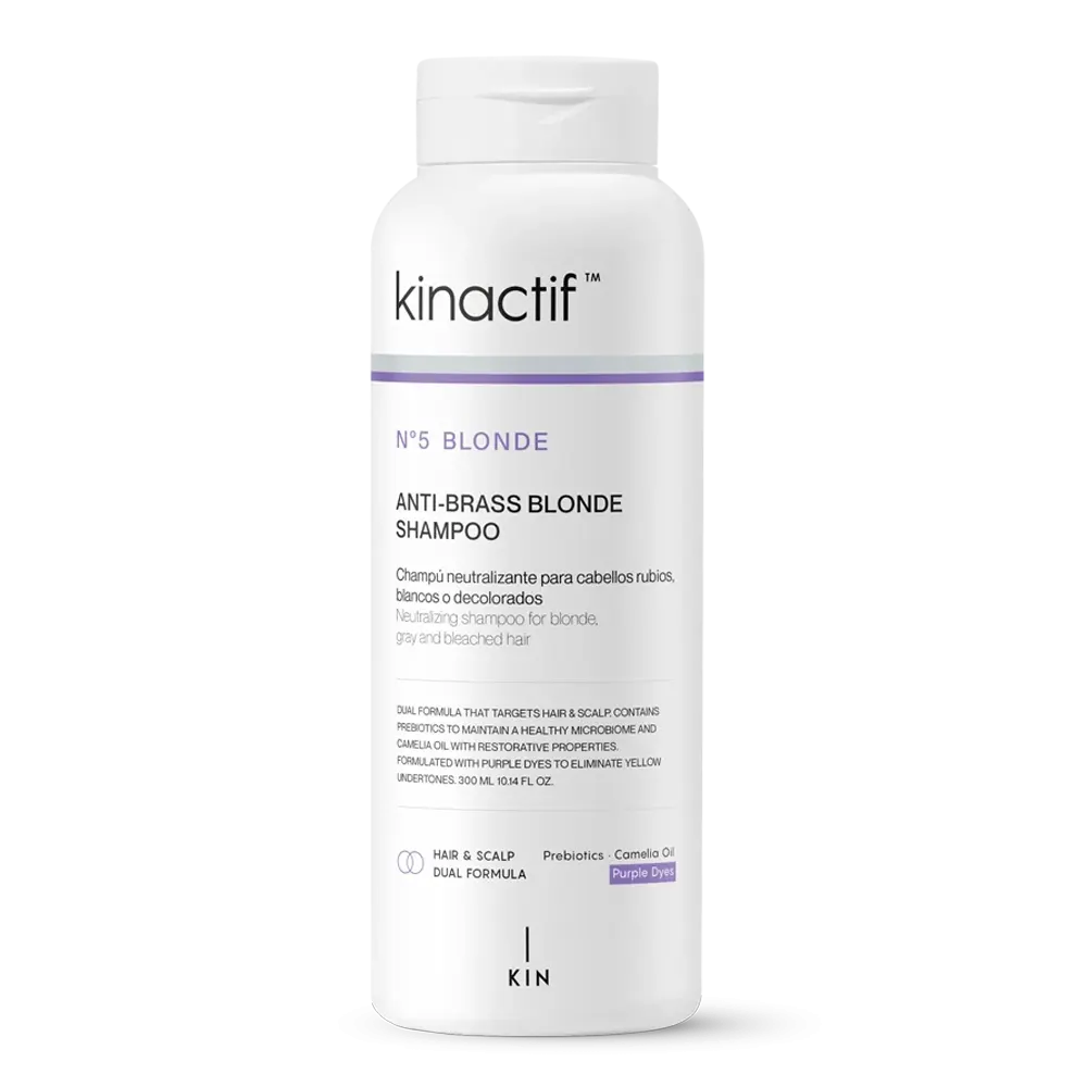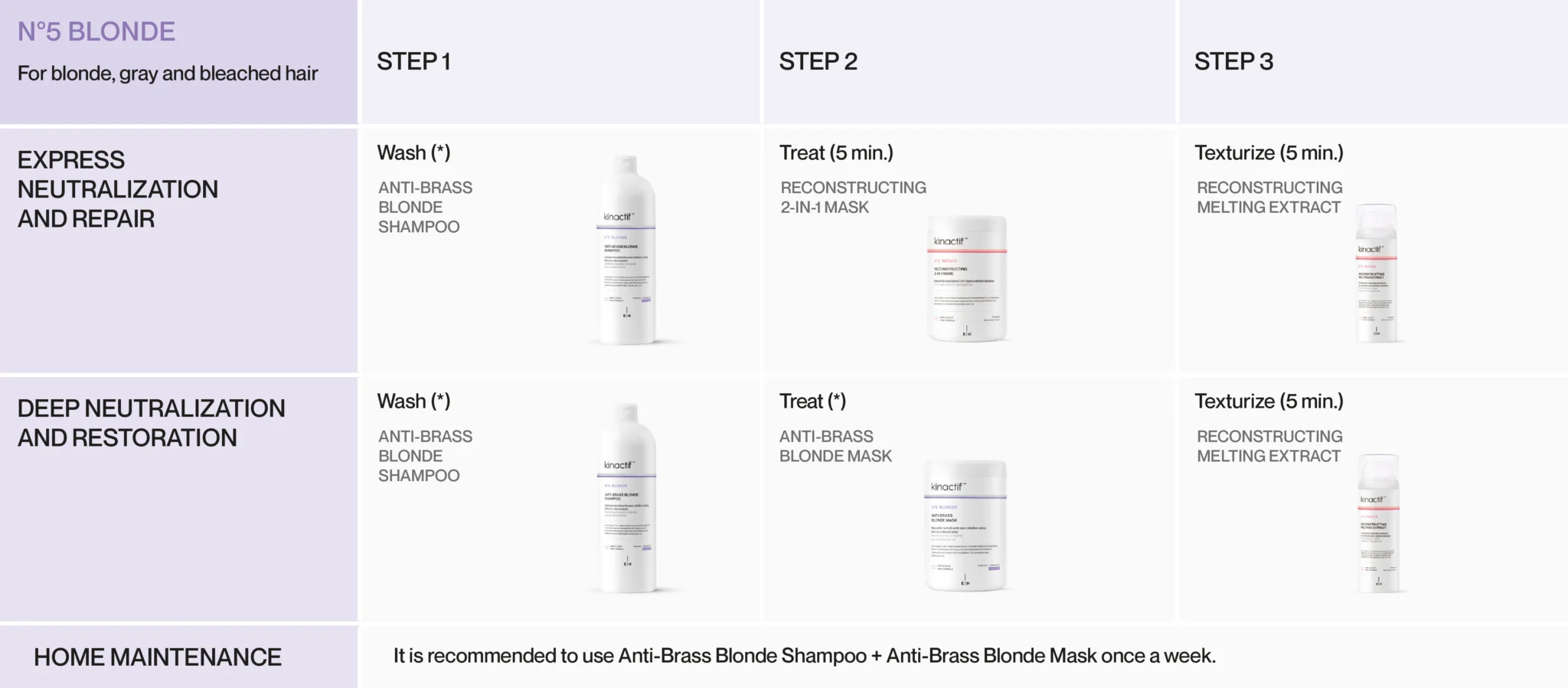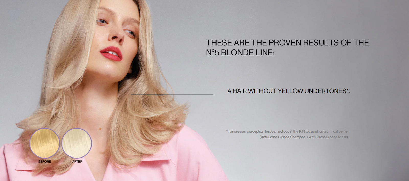 KINACTIF™ N°5 BLONDE neutralizes unwanted yellow undertones, providing a cool highlight and bringing back lost shine, while restoring the softness of the hair fiber.